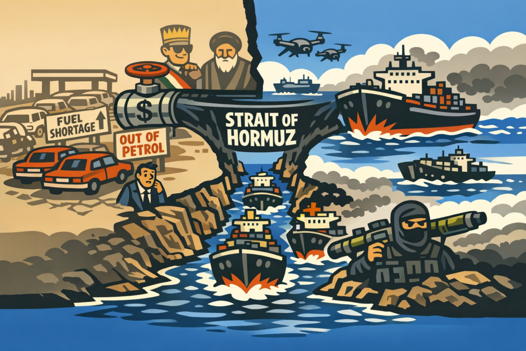 The Strait of Hormuz, through which around a fifth of global oil flows, is a strategic chokepoint vulnerable to conflict, tanker seizures, and infrastructure attacks.