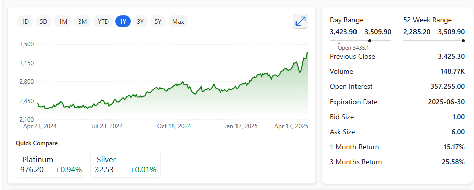 On 1st January 2025, gold was priced at $2,623 per ounce. As of 21st April, 2025, gold has surged to $3,373.70 per ounce.