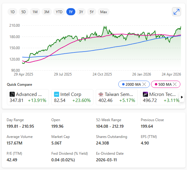 Shares traded around $208–$209, briefly touching valuations as high as $5.12 trillion.