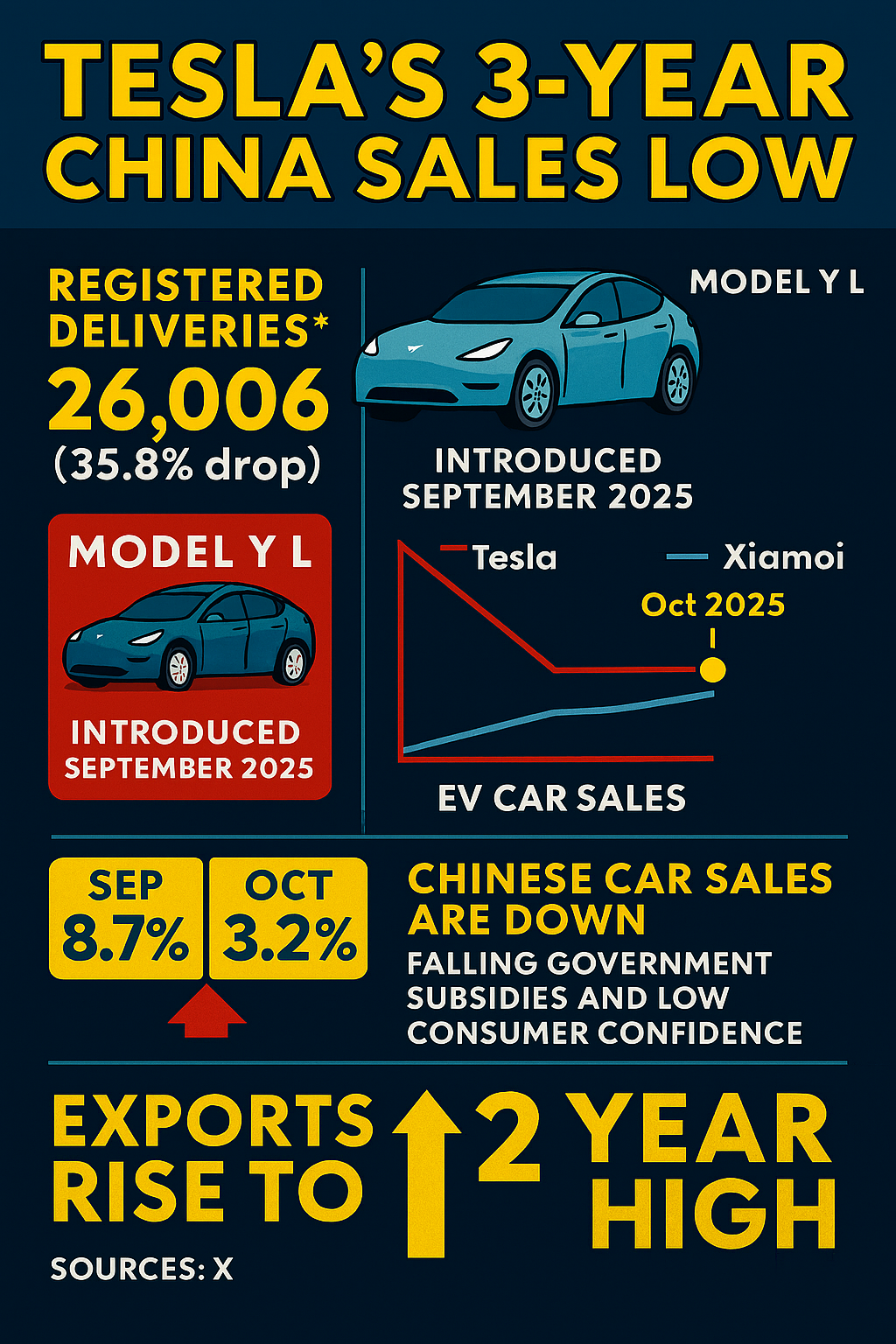 Tesla has hit a troubling milestone in China, with October 2025 marking its lowest monthly sales in three years.
